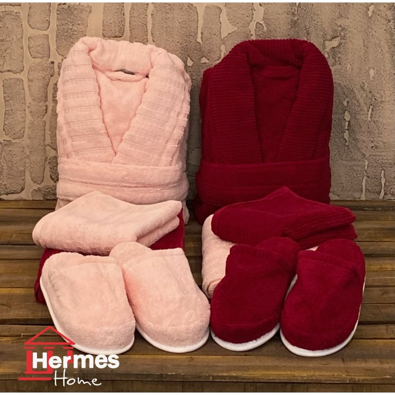 • این ست دارای 2 عدد حوله استخری به ابعاد 130x70 سانتی متر، 2 عدد حوله دستی به ابعاد 80X40 سانتی متر، 2 جفت دمپایی حوله ایی میباشد.